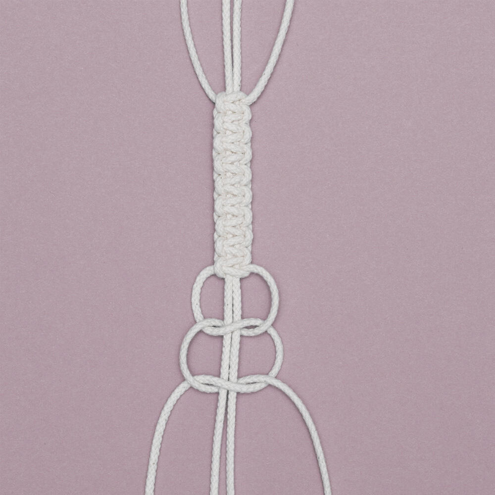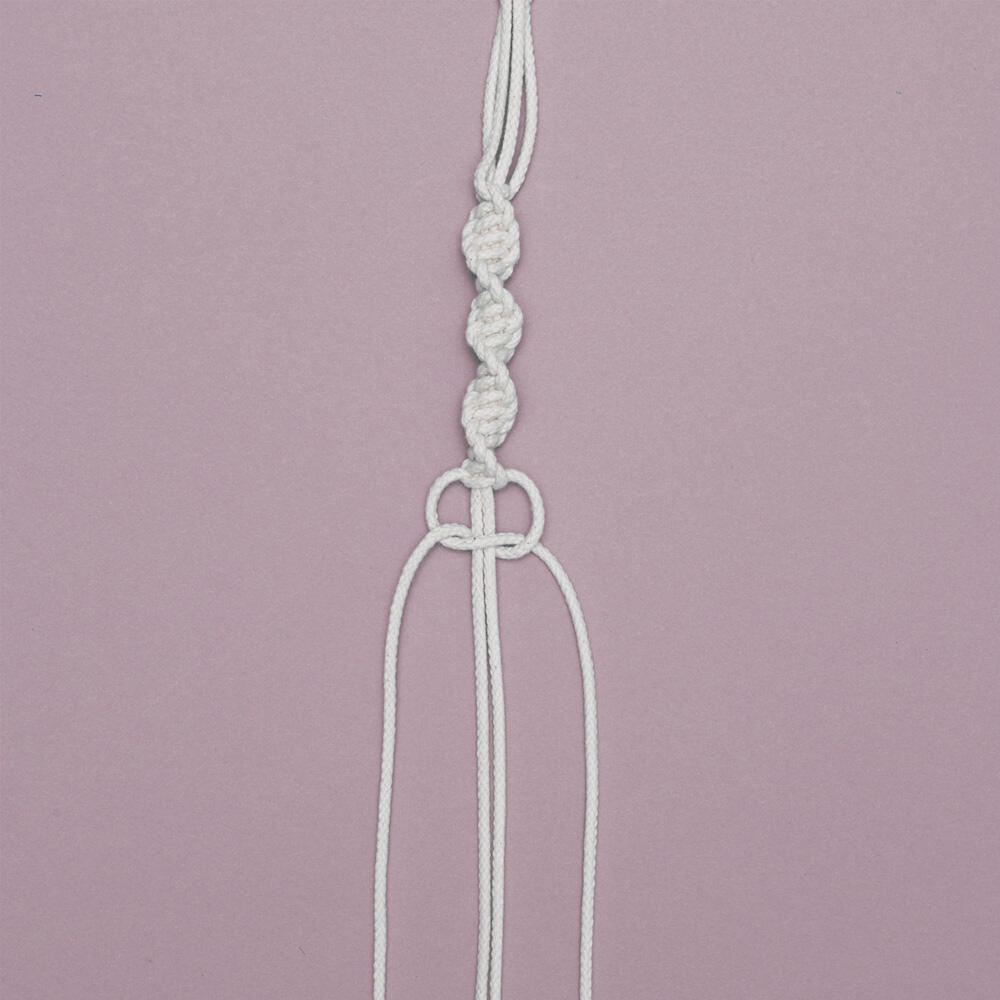 Als het goed is hangen er nog 4 ongebruikte draden onder de lus die je bij stap 3 hebt gemaakt. Herhaal stap 4 t/m 7 op die draden, zodat je drie geknoopte banden overhoudt.