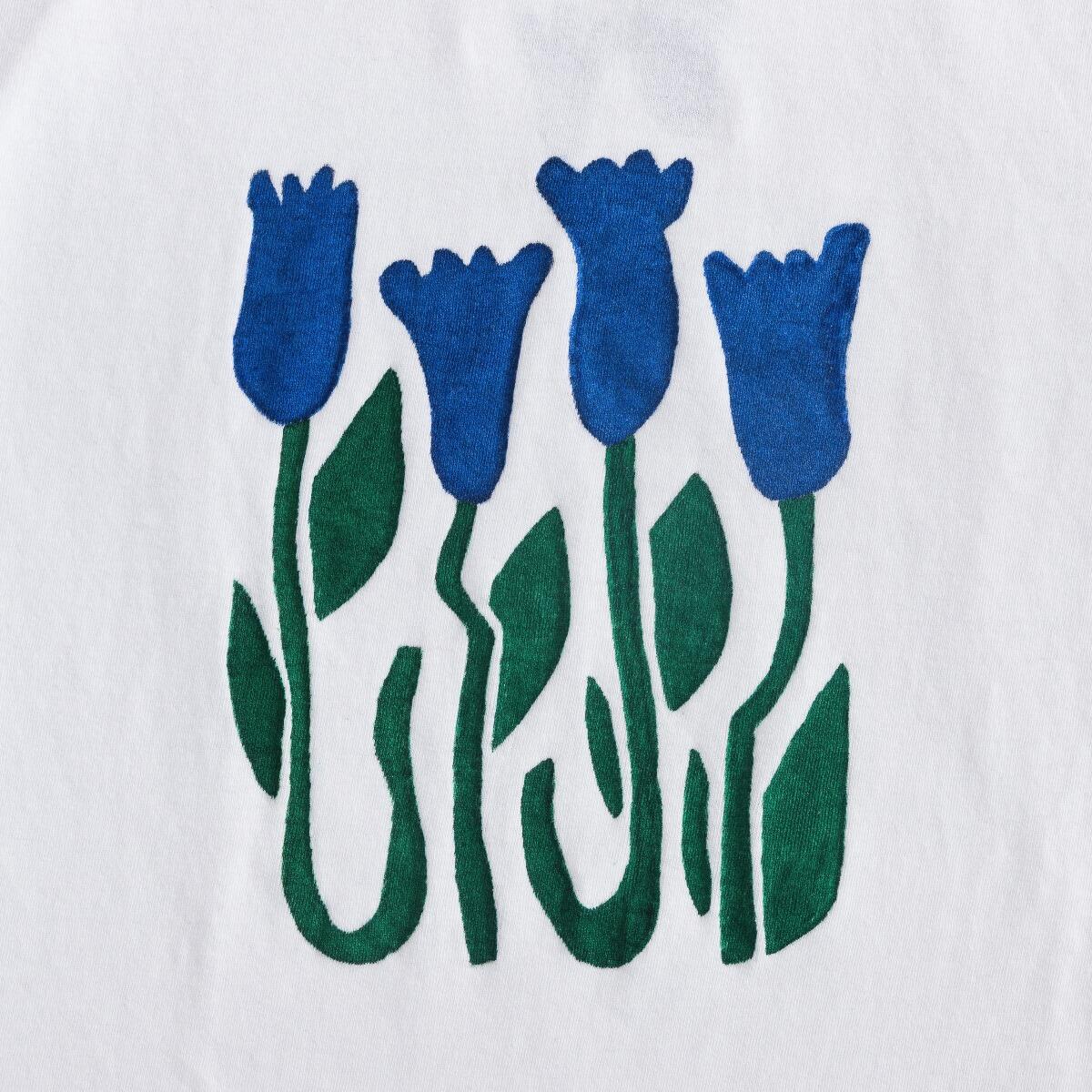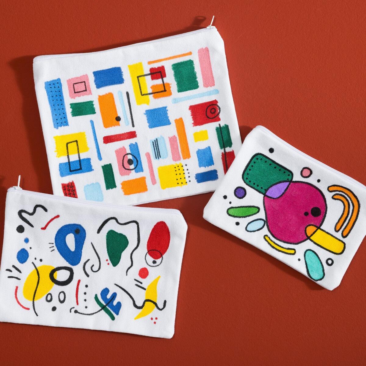 Wil je net als in het voorbeeld blokjes op de stof maken? Gebruik dan schilderstape om banen op de stof te plakken en zo delen af te plakken die je niet wilt versieren. De stiften zijn niet dekkend, dus laat delen die een andere kleur moeten zijn (zoals de tomaten) ongekleurd of teken ze van te voren en kleur er daarna omheen.