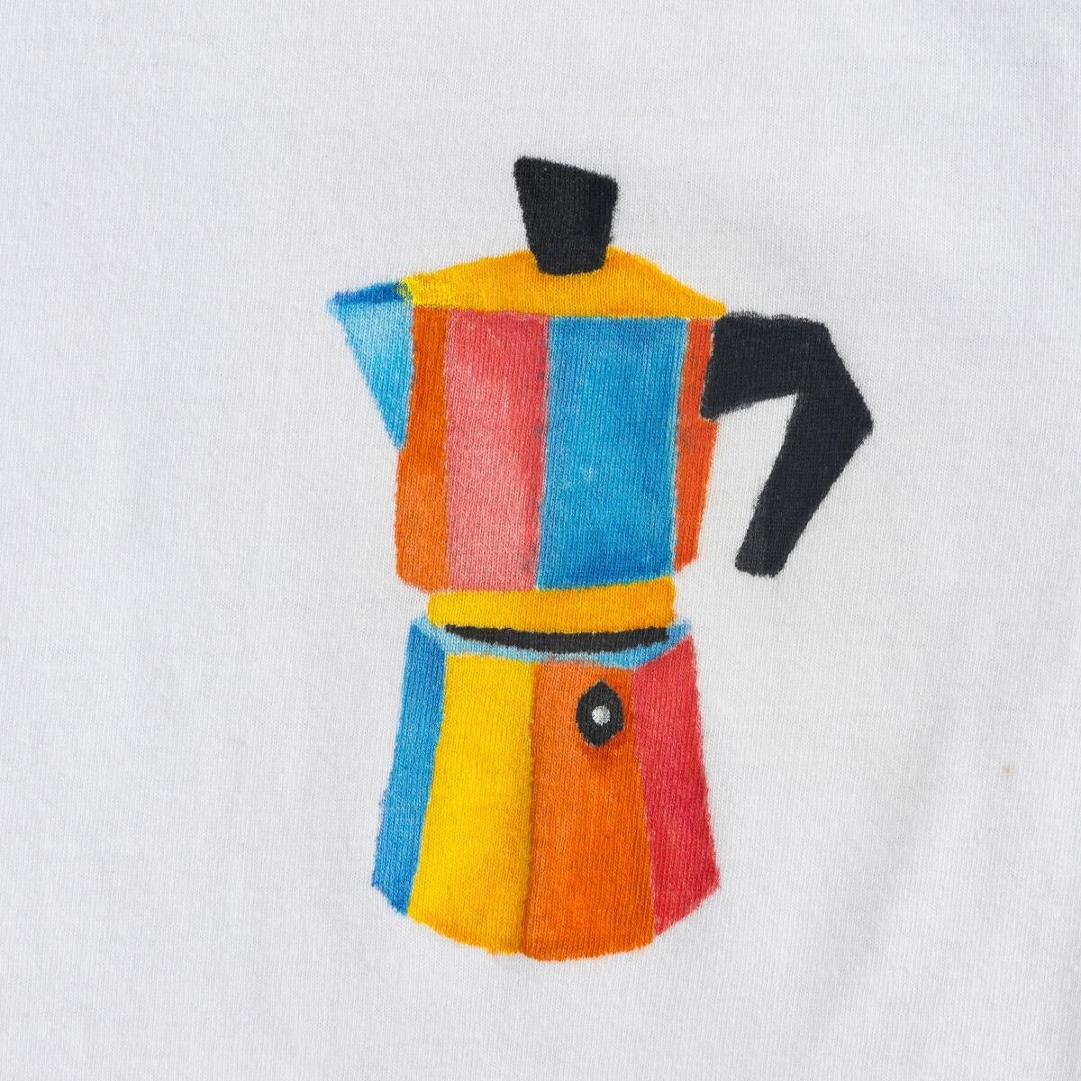 De lichte kleur van het tomatenpartje hebben we gemaakt door snel en oppervlakkig met de stift te kleuren. Het wordt dan niet heel egaal, maar dat past juist wel bij een tomaat. De lichte puntjes hebben we met een witte textielstift gemaakt, maar als je een beetje precies werkt, kun je die ook maken door daar omheen te kleuren.