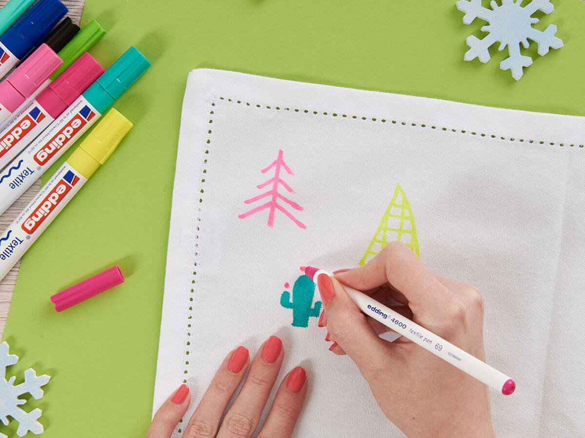 Dit jaar vieren we een kleurrijke Kerst! Maak je eigen servetten met de textielstiften van edding, verkrijgbaar in heel veel vrolijke kleurtjes!
