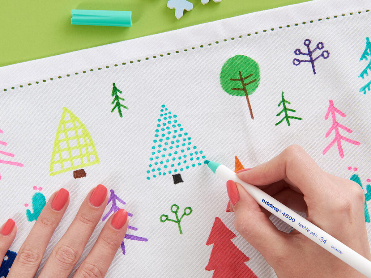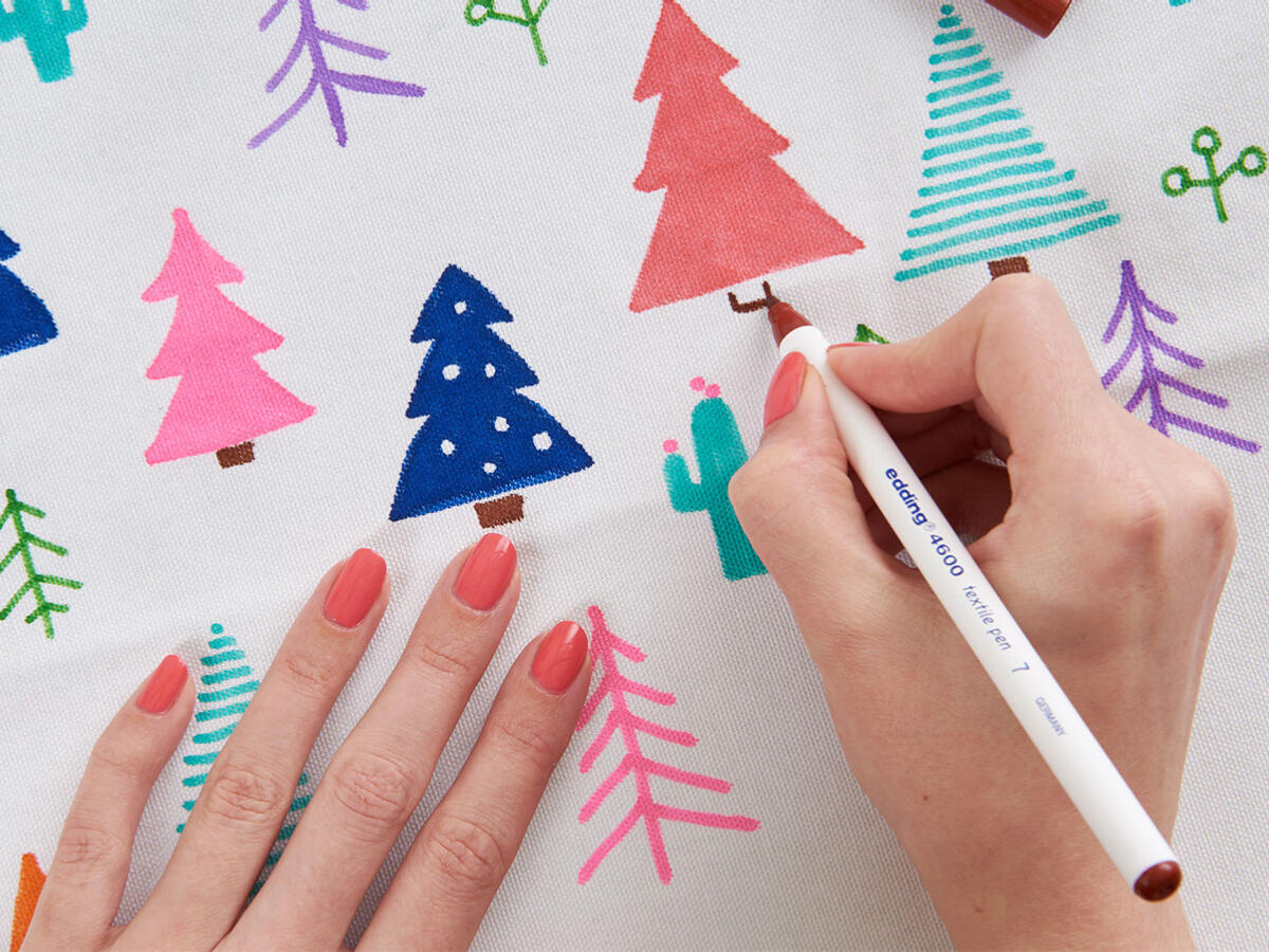 Leg eventueel een stuk karton klaar, aangezien de inkt uit de pennen een klein beetje door kan drukken. Teken vervolgens vrolijke designs op de stof. Bij edding hebben ze voor een leuke mix van cactussen en (kerst)boompjes gekozen.