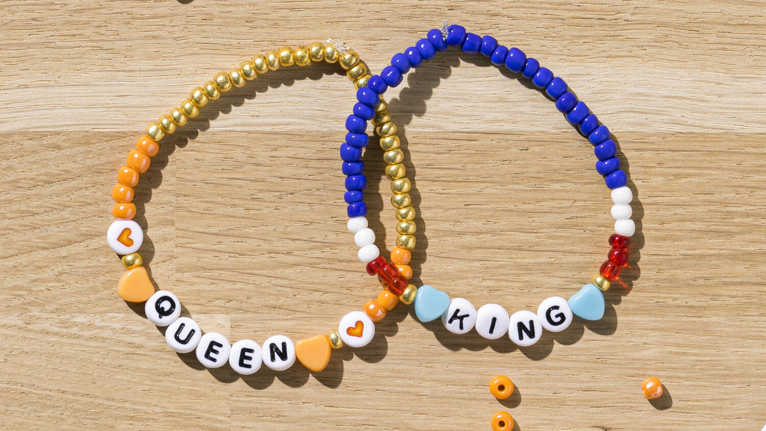 Zo simpel als wat! Rijg alle kralen in de juiste volgorde op een ruim stuk elastisch nylondraad (let even goed op of alle letters ook dezelfde richting hebben) en maak aan het eind een dubbele knoop. Meet tussendoor om je pols, het armbandje moet strak zitten, maar niet uit hoeven rekken zodra het op z'n plek zit. Eventueel kun je het knoopje nog extra vastzetten met een beetje alleslijm.