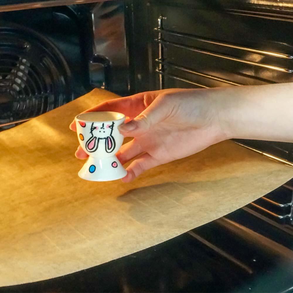 Verwarm de oven voor tot 160 °C. Zet je eierdopjes in de oven en bak ze minstens 25 minuten af om de inkt uit te laten harden. Laat ze daarna met de oven mee afkoelen. Na het bakken zijn de versieringen vaatwasserbestendig (hoewel ze nog langer mooi blijven als je de dopjes met de hand afwast). Fijne Pasen!
