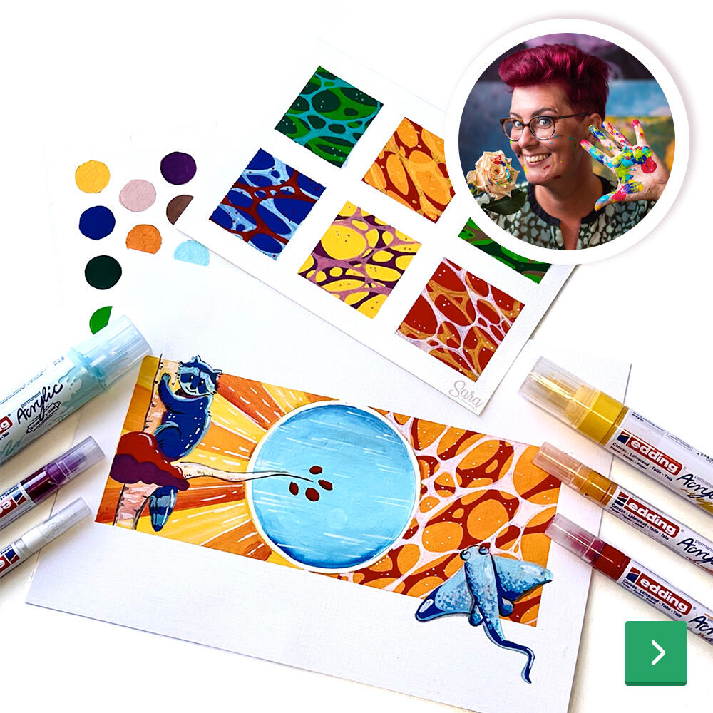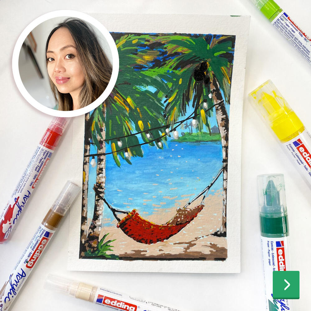 Op de hoek van de straat of op het strand: wie Jesamine kent, weet dat zij overal de meest geweldige illustraties maakt. En laat de edding acrylverf markers nou net geschikt zijn voor waar en wanneer jou dat uitkomt! Voor deze workshop liet Jesamine zich inspireren door een strand in de Filipijnen. Ze gaat ons tijdens deze workshop op een andere manier gebruik laten maken van de acrylverf markers én hoopt ons te inspireren om op vakantie de tekenspullen er ook eens bij te pakken! Met de handige set edding acrylic markers is dit super eenvoudig. Zo maak je de leukste herinneringen op papier over de hele wereld! Let's go!