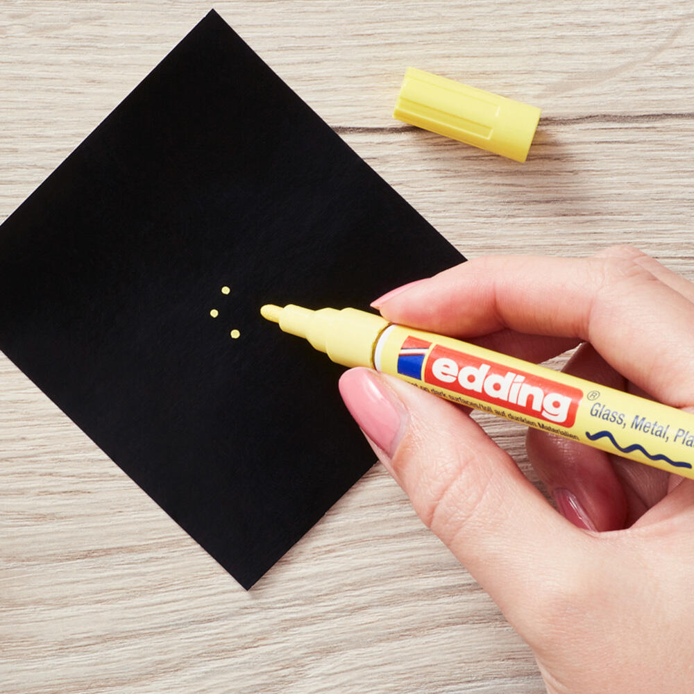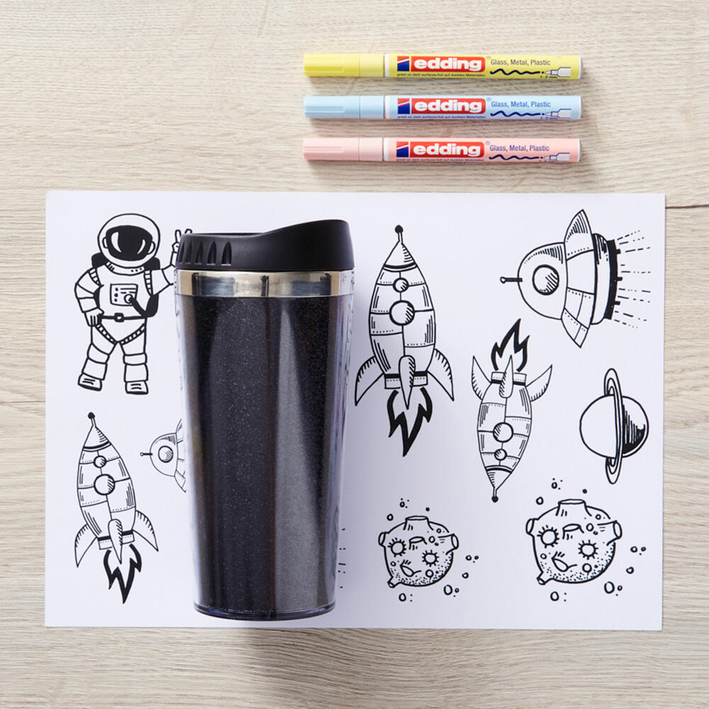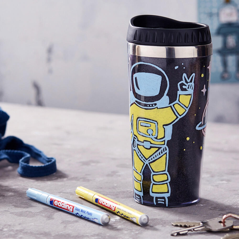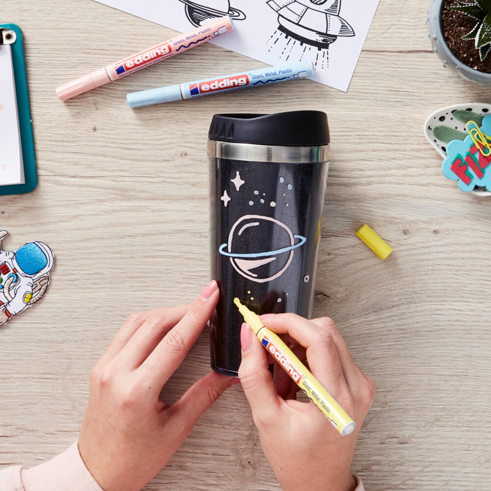 Volg hieronder de stappen en maak je eigen galactic travel mug! Zorg dat je de lijnen goed laat drogen voor je hem mee op reis neemt (ongeveer een dag, dan is hij ook goed uitgehard). Je kunt je thermosfles het beste met de hand wassen. Laat hem dan niet te lang in warm water weken, want dan zal de lak sneller slijten.